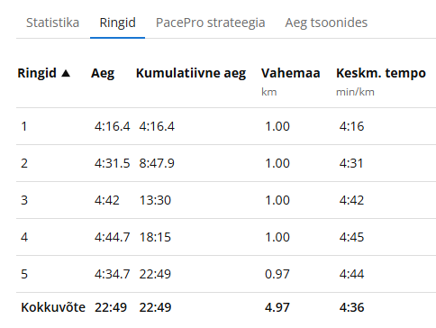 Ma ei hakka valetama. Eesmärk oli joosta oma uus isiklik rekord ja saada ajaks midagi alla 22 minuti. Arvestades kui palju ma viimastel nädalatel jooksnud olin + ma ei olnud lühemateks jooksudeks üldse valmistunudki, tundub see tagasi vaadates veidi loll mõte. Aga loll mõte ei ole mind kunagi enne takistanud ja nii ka seekord. Ega ma palju sellest jooksust ei mäletagi. Ainuke mälestus on see, et ma alustasin liiga kiiresti ja jooksin ennast teiseks kilomeetriks täielikult kinni. Edasi tuleb veidi mälu värskendada ja Garminilt abi küsida.