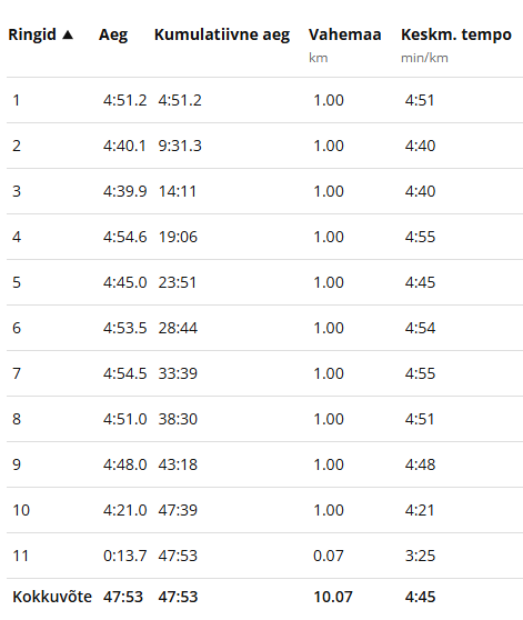Ega umbes nii see jooks läks ka. See on siiani minu ainuke üle tunni aja 10 kilomeetrit aga ma olen lihtsalt tänulik, et ma selle jooksu üldse lõpetasin. Lisaks haigusele oli sellel päeval ka õues väga soe ilm ja haigus + kuumus ei ole kunagi kokku sobinud. Rohkem ma sellest jooksust meenutada ei taha.